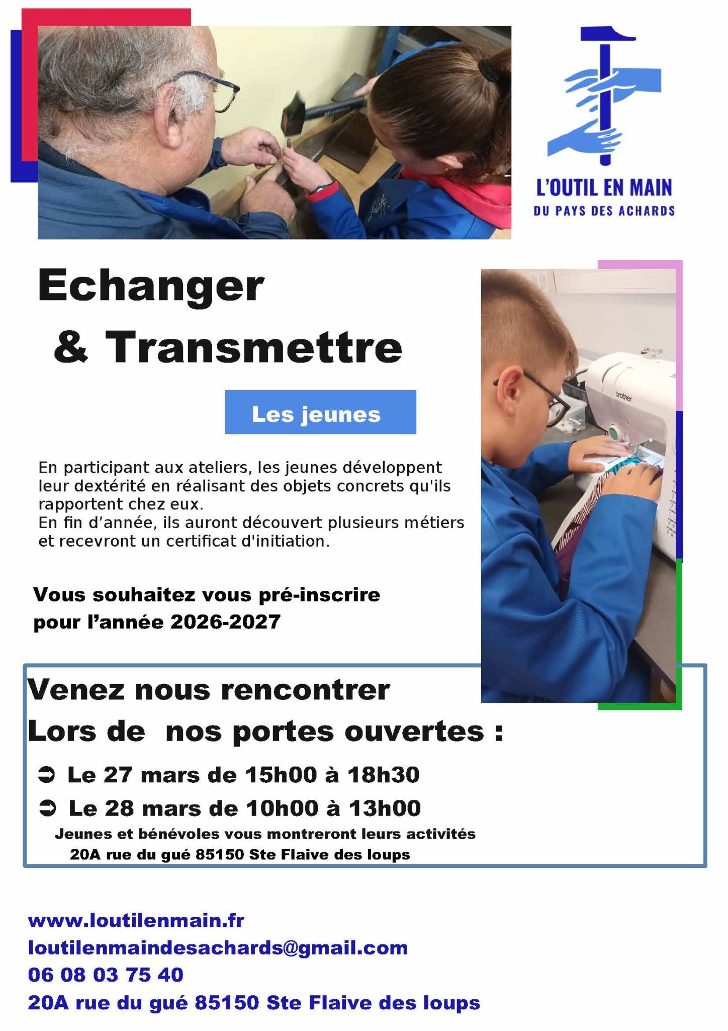 L'Outil en Main ouvre ses portes le vendredi 27 mars de 15h00 à 18h30 et le samedi 28 mars de 10h00 à 13h00. Jeunes et bénévoles vous montreront leurs activités. loutilenmaindesachards@gmail.com - 06 08 03 75 40 20A rue du Gué - Ste Flaive-des-Loups