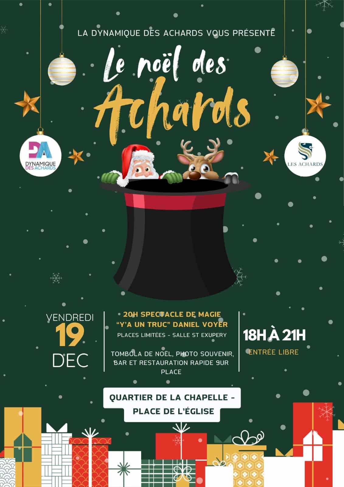Le Noël des Achards aura lieu le vendredi 19 décembre de 18h à 21h - place de l’église, Quartier de la Chapelle. Venez vivre l'ambiance d'une soirée de Noël magique, chaleureuse et pleine de convivialité ! Au programme : - Spectacle de magie Y'a un truc avec Daniel Voyer : A 20h - Salle st... Voir l'article